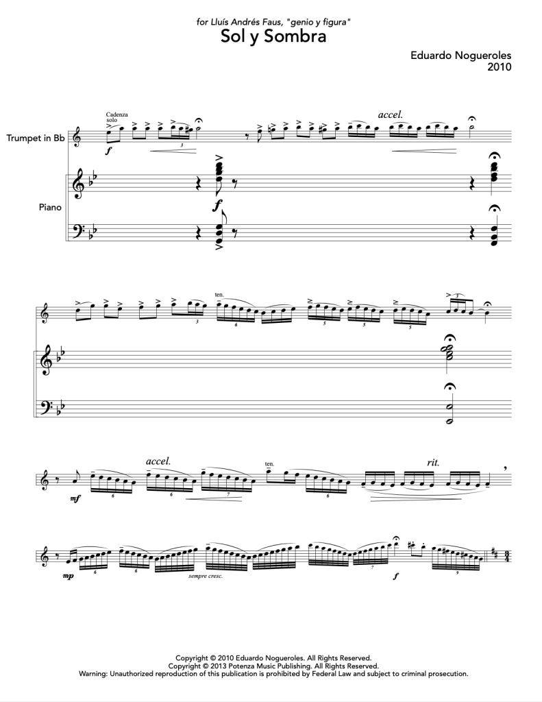 SOL Y SOMBRA (4:30) fue un encargo del trompetista Lluís Andrés para su disco «Trompetes al Vent». Es una pieza alegre y festiva, en forma de malagueña y con una espectacular entrada de trompeta en forma de cadencia. En definitiva, una pieza fresca y viva, a la vez que virtuosa y divertida para el solista.